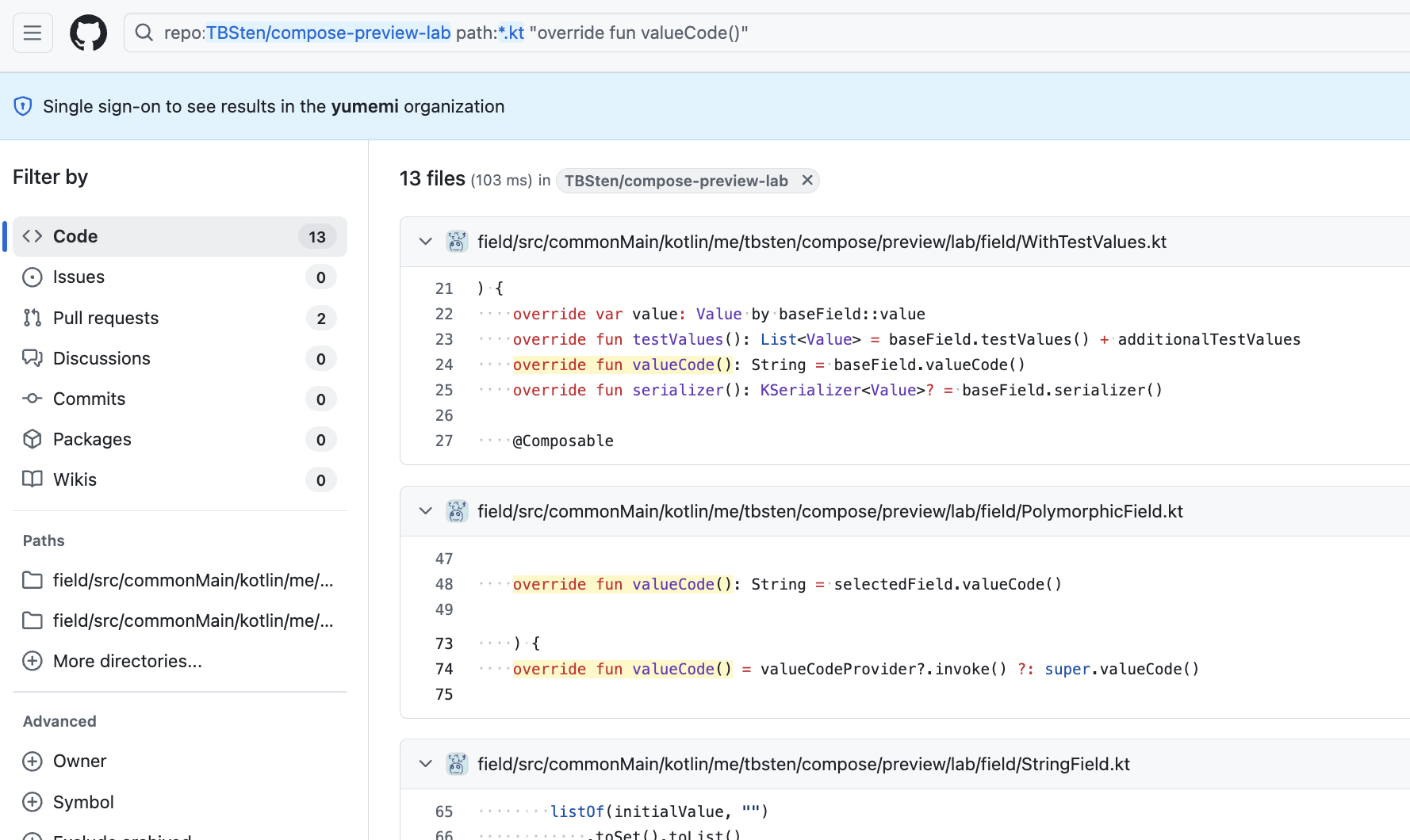 例えば valueCode() メソッドの実装方法に悩んだ場合, Compose Preview Lab の Github リポジトリの検索窓 から "override fun valueCode()" のように入力して valueCode() をオーバーライドしているコードを検索することで有用な実装が見つかるかもしれません。